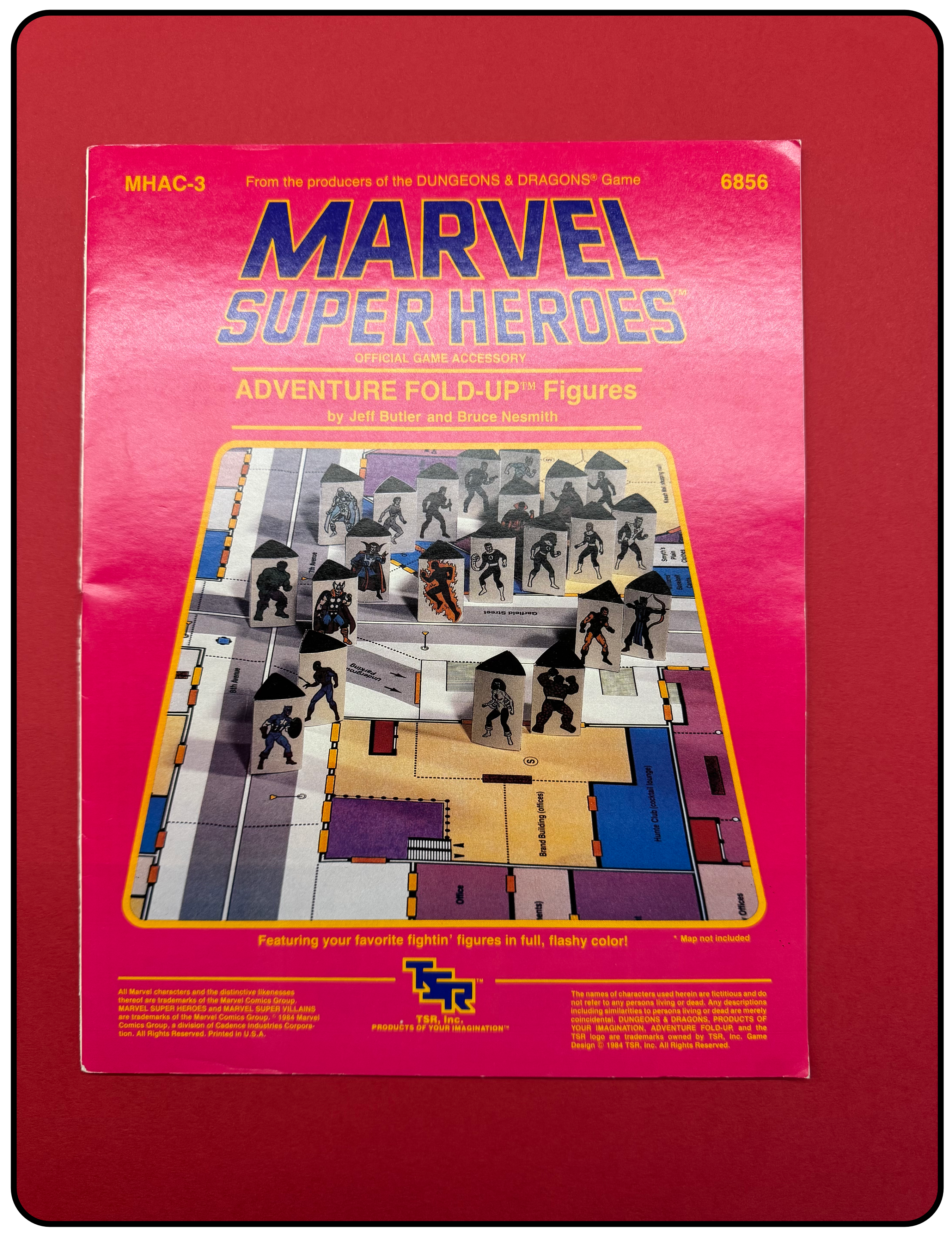 Name: Marvel Super Heroes Adventure Fold-up Figures Company: TSR, Inc. Type: Accessory / Figures Year: 1984 Catalog Number: 07:03:00:0006:C21 Main Category: Games Sub Category: Role-playing Games Secondary Category: None Details: This game accessory includes poster board thickness pages of Marvel characters that can be cut out and folded to create a stand-up figure to use on game maps. Eight pages of figures is included.