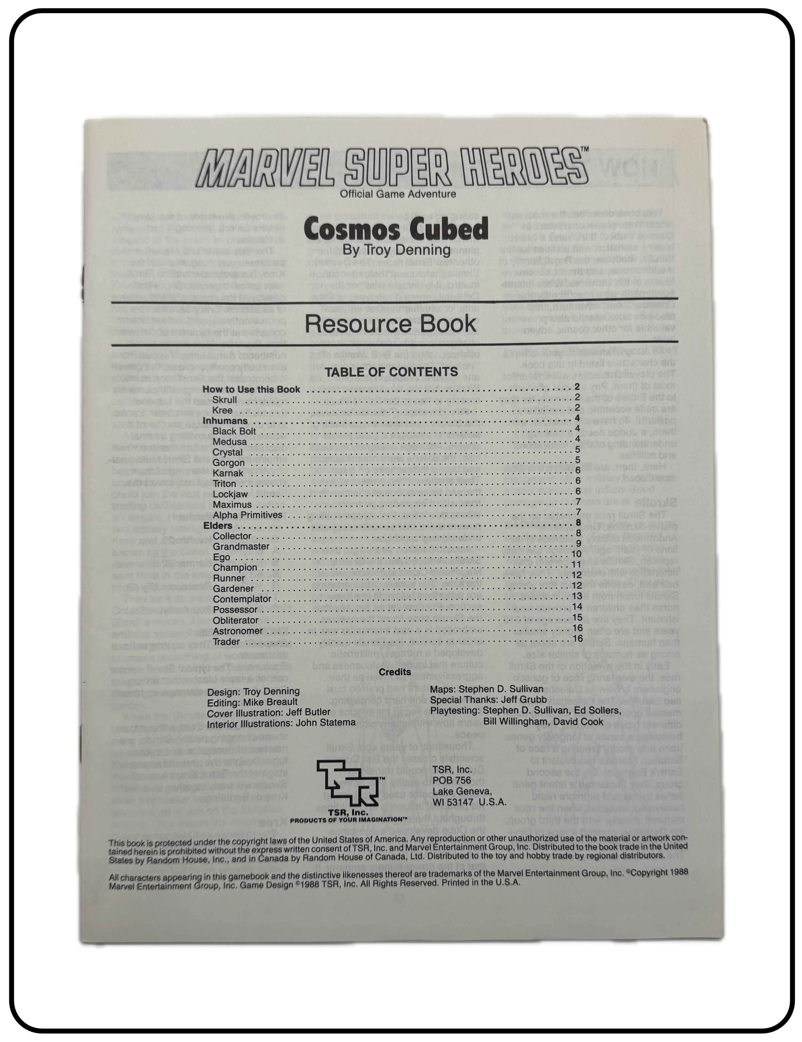 |  | Name: Marvel Super Heroes Cosmos Cubed Company: TSR, Inc. Type: Adventure / Advanced Accessory Year: 1988 Catalog Number: 07:03:00:0008:C21 Main Category: Games Sub Category: Role-playing Games Secondary Category: None Details: This is an adventure/module by Troy Denning for the Marvel Super Heroes role-play game. It is designed for cosmically powered super heroes like Dr. Strange, Thor, Silver Surfer, etc. The Watcher has assembled some of the most powerful super heroes and sent on a mission to a faraway planet where they discover a secret that threatens the very universe! It includes an Adventure Book, Resource Book and a large foldout section with several maps. |