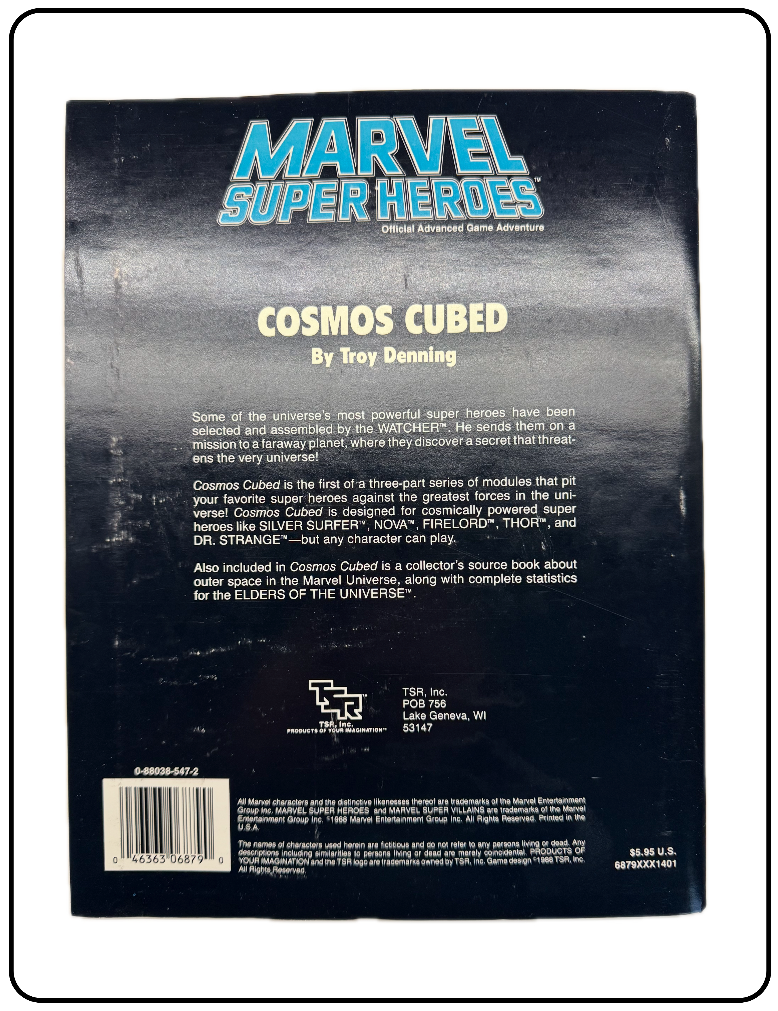 |  | Name: Marvel Super Heroes Cosmos Cubed Company: TSR, Inc. Type: Adventure / Advanced Accessory Year: 1988 Catalog Number: 07:03:00:0008:C21 Main Category: Games Sub Category: Role-playing Games Secondary Category: None Details: This is an adventure/module by Troy Denning for the Marvel Super Heroes role-play game. It is designed for cosmically powered super heroes like Dr. Strange, Thor, Silver Surfer, etc. The Watcher has assembled some of the most powerful super heroes and sent on a mission to a faraway planet where they discover a secret that threatens the very universe! It includes an Adventure Book, Resource Book and a large foldout section with several maps. |